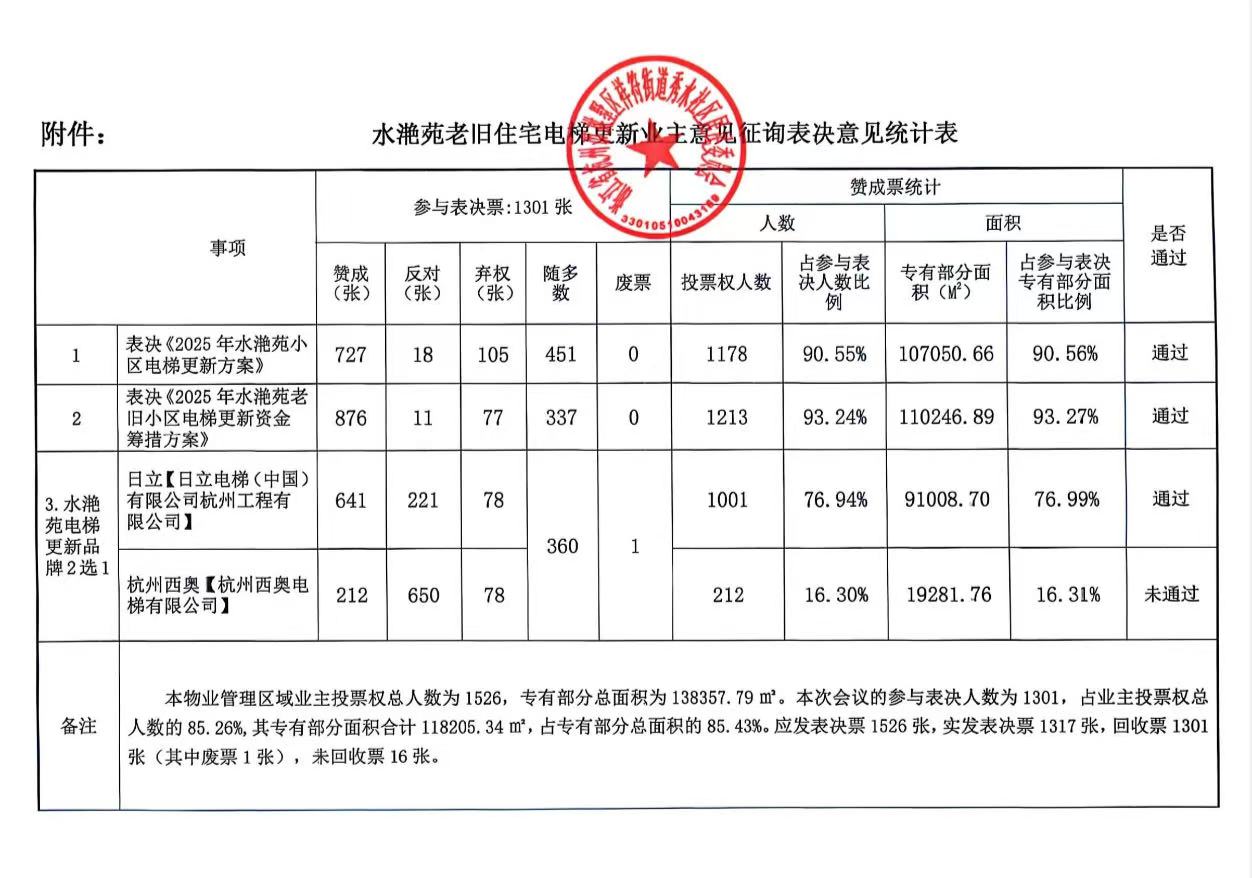 2025年7月9日社区发布《关于水滟苑老旧住宅电梯更新业主意见征询的公告》,2025年7月15日9时-2025年7月21日12时在水滟苑小区进行老旧住宅电梯更新业主意见征询投票,表决通过2025年水滟苑小区电梯更新方案、2025年水滟苑小区老旧电梯更新资金筹措方案,决定选用日立电梯,参与表决业主占业主投票权总人数的85.26%。7月22日,社区向全体业主发布上述结果。