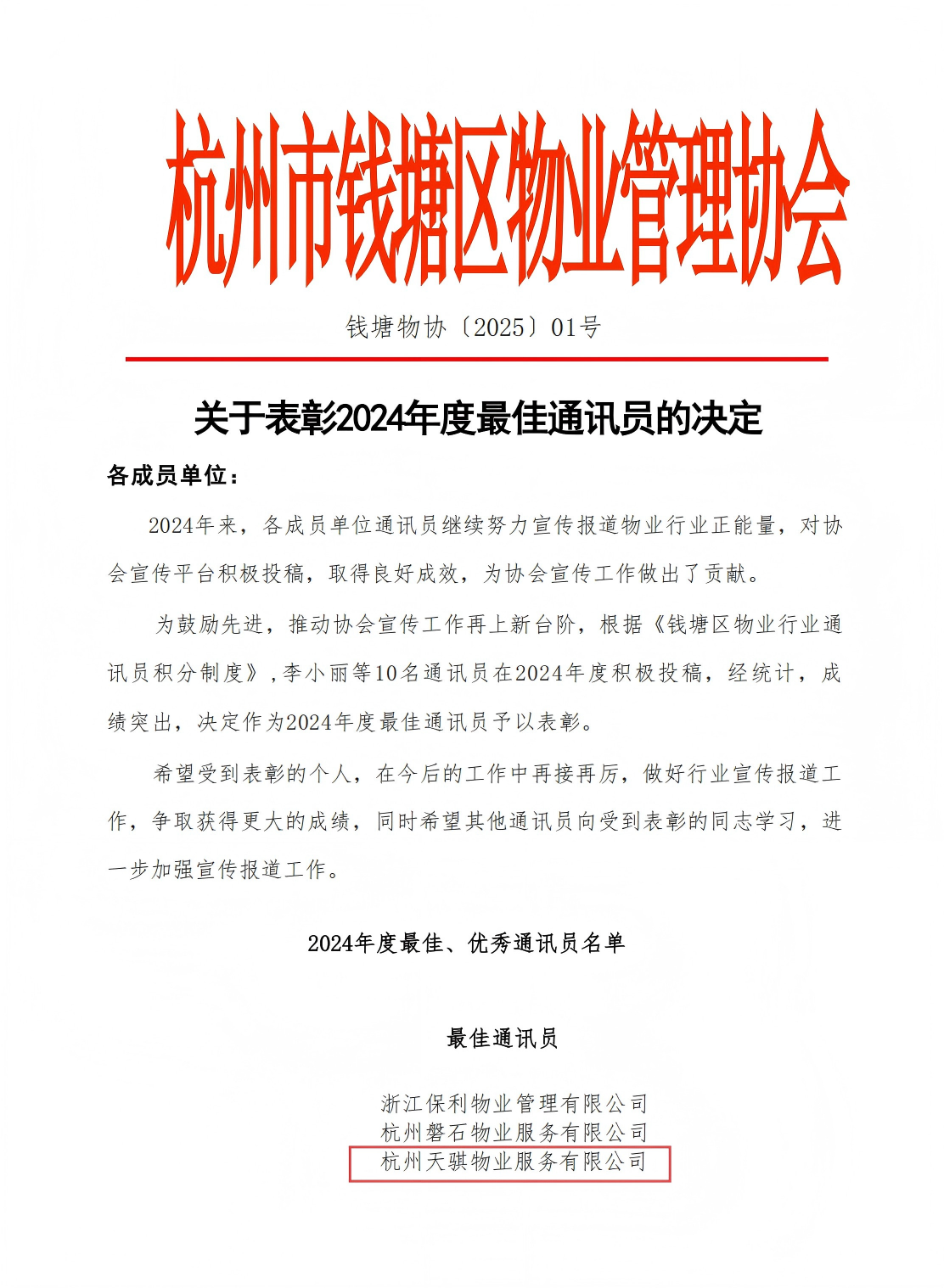 在8月8日召开的2025年钱塘区物业行业半年度工作会议暨2024年度表彰大会上,杭州天骐物业服务有限公司被钱塘区物业管理协会表彰为2024年度最佳通讯员单位,这是天骐物业连续第五年荣获钱塘区物协最佳通讯员单位。