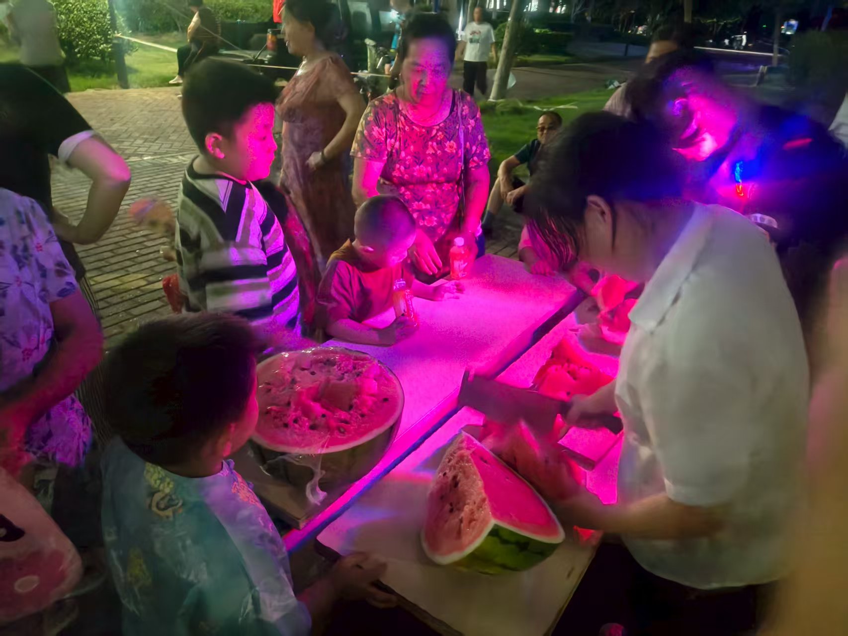 放映现场,天骐物业工作人员提前准备好西瓜,分发给前来观影的居民。孩子们捧着西瓜边吃边看,不时发出阵阵欢笑;大人们摇着扇子,一边观影一边闲聊家常,现场一派热闹祥和的景象,欢声笑语不断。