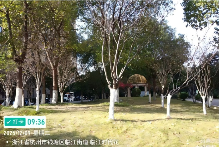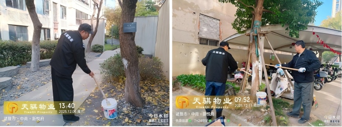随着冬季气温逐渐降低,为有效防止园林树木遭受冻害并杀灭越冬病虫害,保障树木来年健康生长,杭州天骐物业服务有限公司组织养护工人,对在管的多个项目行道树、景观树开展“刷白”养护工作。